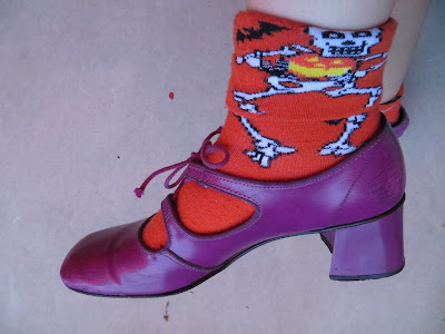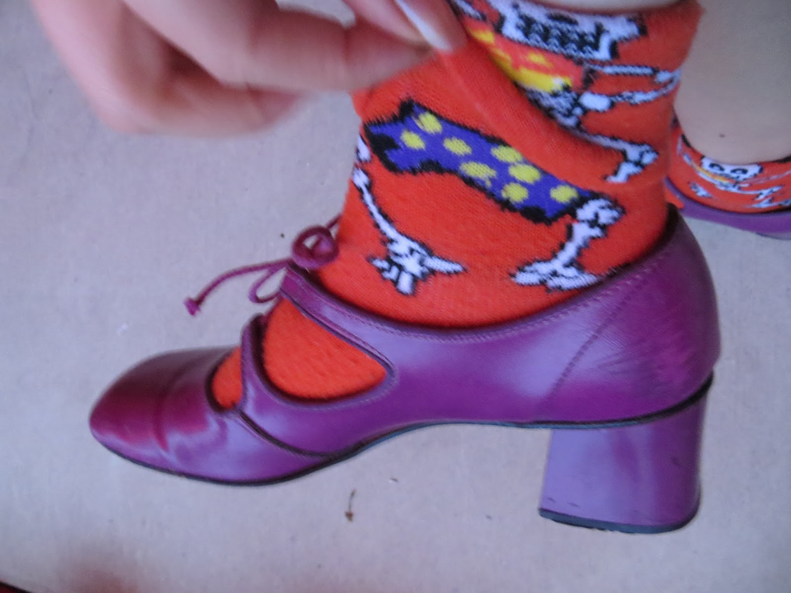I found those shoes a decade or so ago at a thrift shop for $3.00. They're from the 60s and really well made. These kind of heels appear to be in style this year too. I'd been doing some of that genealogy research at the library and saw some old school photos of my grandmother on Ancestry where she and the other girls were wearing little foldover socks with their shoes. I thought "That is so cute! I want to try that!" So I had a chance to for the party, and this is my version of that look.