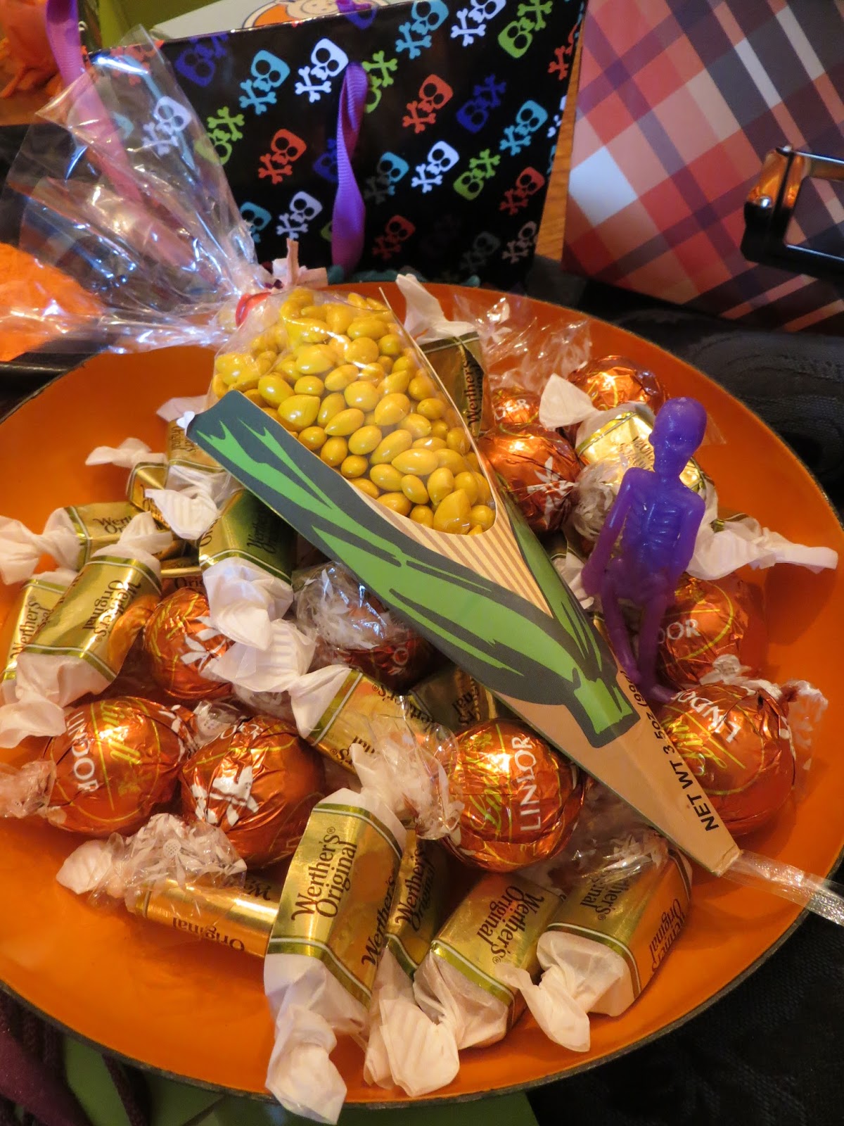 Chocolate covered sunflower seeds, which I thought were popcorn kernels and some really good candy. Werther's Original caramel apple and Lindt's pumpkin filled chocolates.